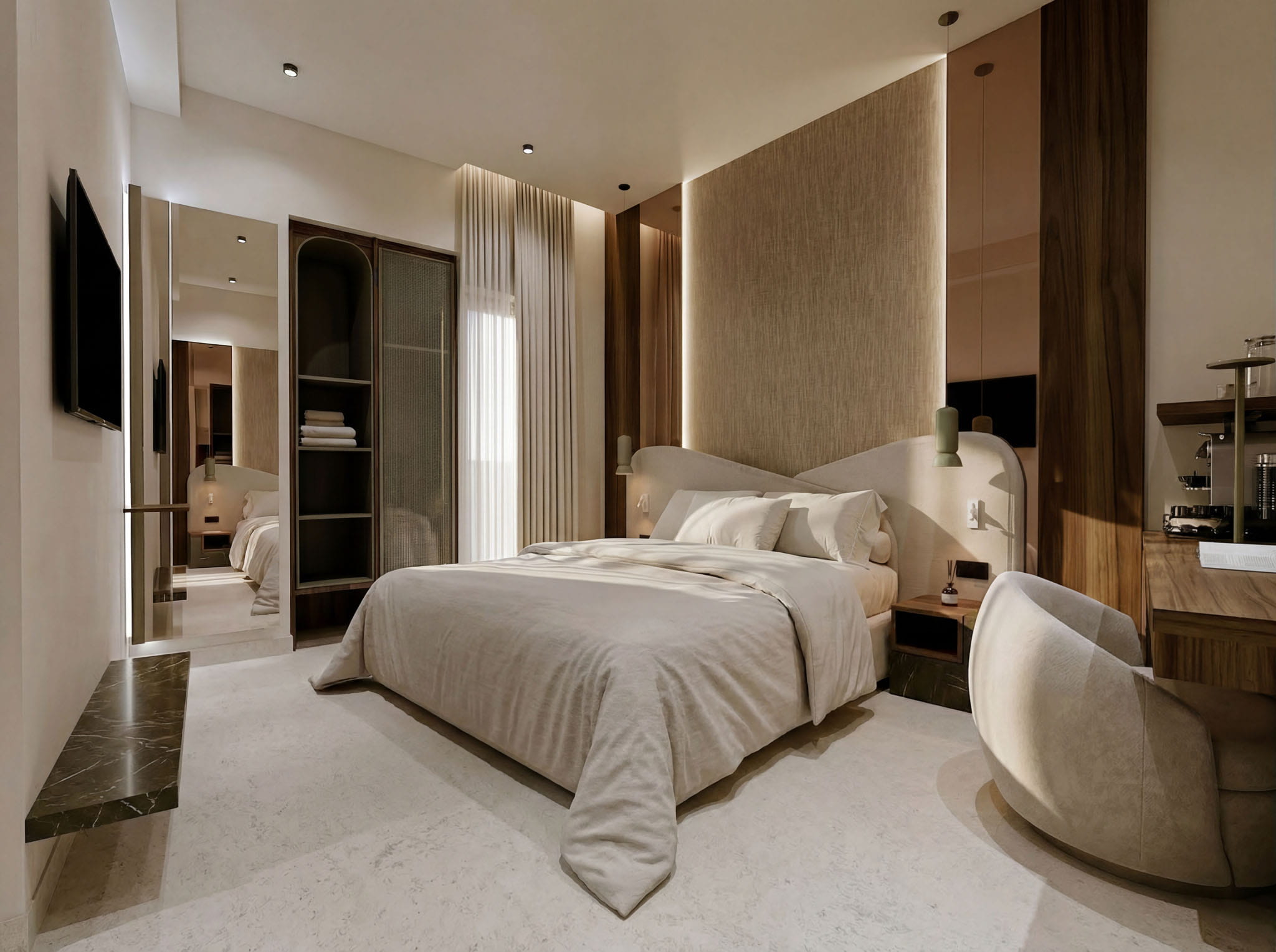 A room with elegant aesthetics, located at the rear of the building for enhanced tranquility, ideal for guests seeking a relaxed environment in the city center. Modern design and comfortable spaces provide a restful stay.